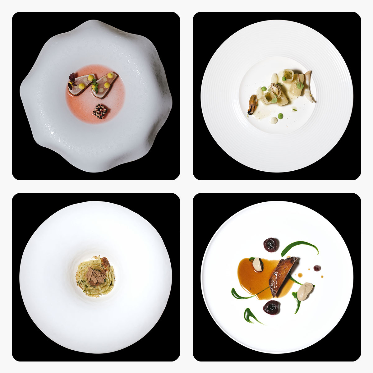 Negli appetizer di benvenuto, la rana pescatrice viene servita con una insalatina fresca di finocchi e salsa di arancia; l’ostrica è immersa nella salsa beurre blanc; una alice leggermente marinata si arrotonda con le sfere di olio extravergine; la “fake cherry”, finta ciliegia di paté di fegatino toscano, con l’aggiunta di acciuga e cappero, è glassata esternamente con la stessa ciliegia. A chiudere, un cono croccante ripieno di una dadolata di ricciola, ricotta e aglio nero.