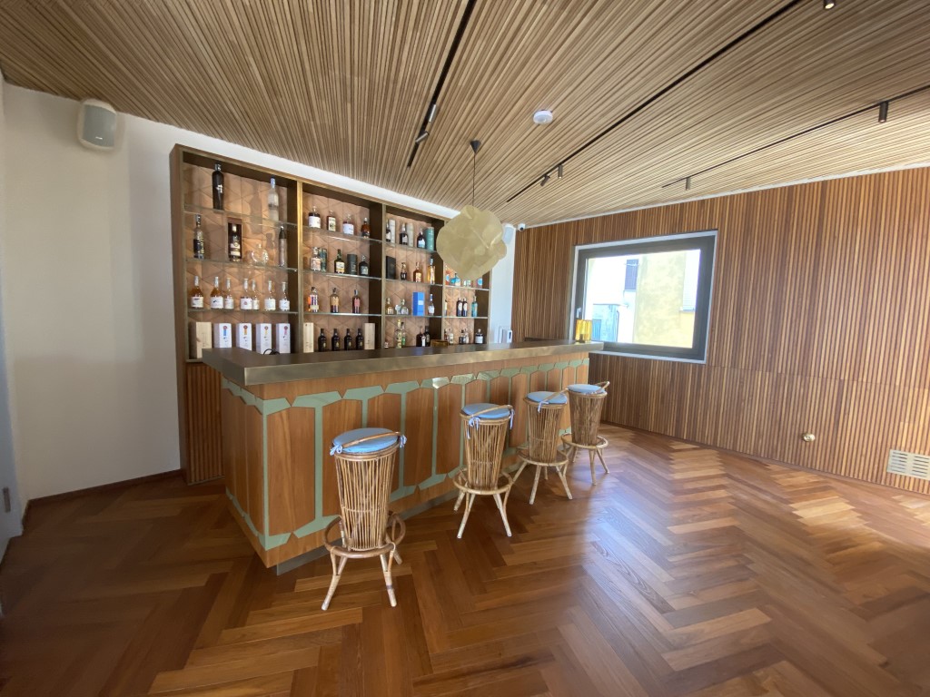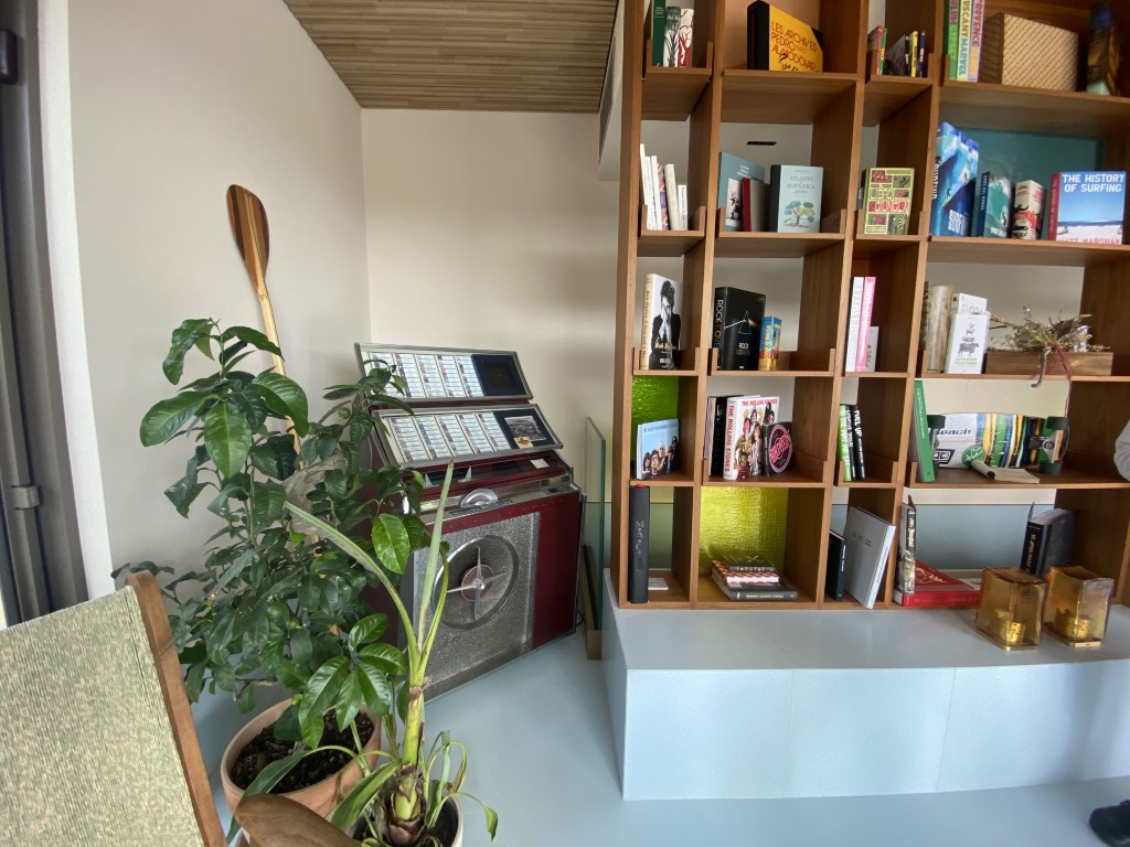 Stefano, sommelier con alle spalle studi in botanica, cura insieme al maître Alessio Di Iorio la cantina ricavata nella roccia, dove giacciono circa cinquecento etichette, fra denominazioni emiliano-romagnole, italiane e francesi. La compagna Allegra, ex designer di Etro, si è occupata personalmente del restauro e della scelta dei materiali per gli ambienti e gli arredi che riuscissero a creare una continuità con l’esterno. Come il turchese chiaro dei pavimenti che in prospettiva si unisce a quello dell’Adriatico, “quell’azzurro rarefatto” scriveva Mario Luzi “a cui non contrasta da terra nessun altro colore deciso, ma risponde se mai qualche tinta tenue e spenta che può lontanamente specchiarlo”. Riuscendo simultaneamente a mantenere una connessione con la vita precedente del locale, negli anni ‘50 una sala da ballo, quindi la scelta della graniglia dei tipici pavimenti dell’epoca che qui ricopre alcune pareti. O il juke-box vintage in una delle sale al secondo piano, che evoca una atmosfera da relax casalingo, con camino e libreria. Dove c’è in previsione di creare un lounge bar per il dopocena del periodo invernale.