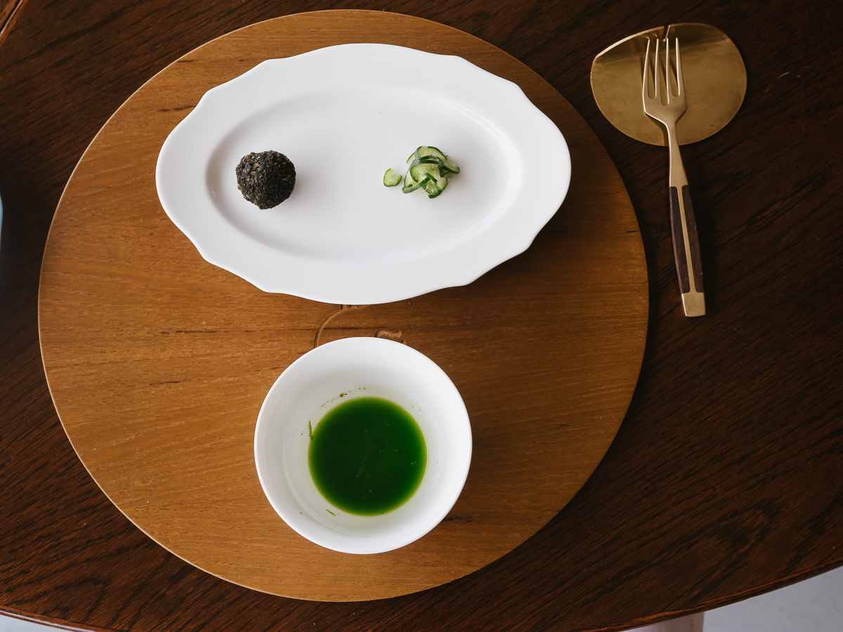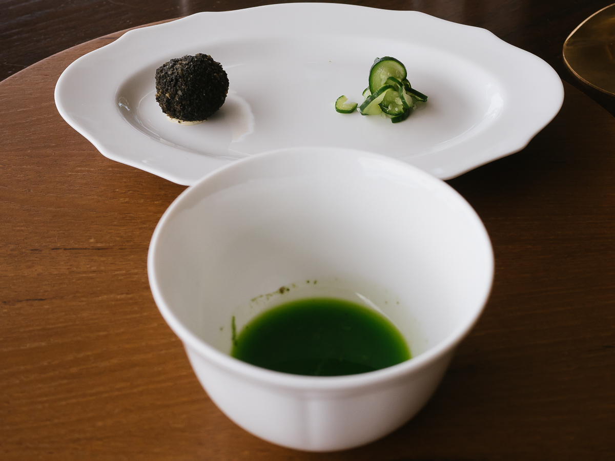 Una stilizzazione degli ambienti naturali lì intorno apre lo scorrazzare degli appetizer di benvenuto. Un brodo alla salicornia e lime, che sapido e iodato, appena acidulo, evoca il mare. Una oliva ascolana con ripieno al tartufo simboleggia il Montefeltro. Il cetriolo leggermente marinato in aceto e sale rappresenta l’orto di Casa Marcon, da dove arriva gran parte di tutta la materia vegetale lavorata in cucina.