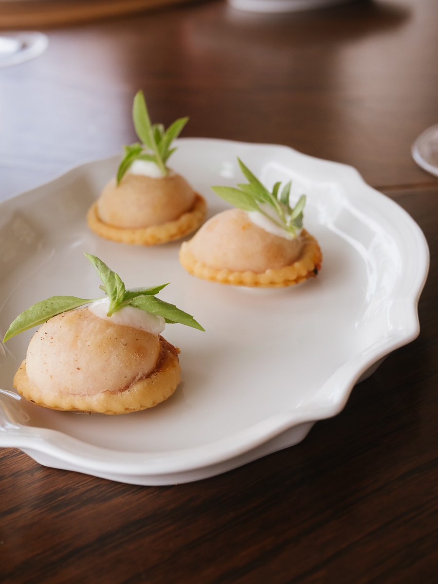 La rana pescatrice è un calembour sulle coscette di rana fritte tipiche dell’entroterra, qui reinterpretate con il pesce che con l’anfibio condivide il nome, gratinato alle erbe. Una misticanza aromatica fa da intermezzo con le lumache alla bourguignonne con aglio dolce e prezzemolo.