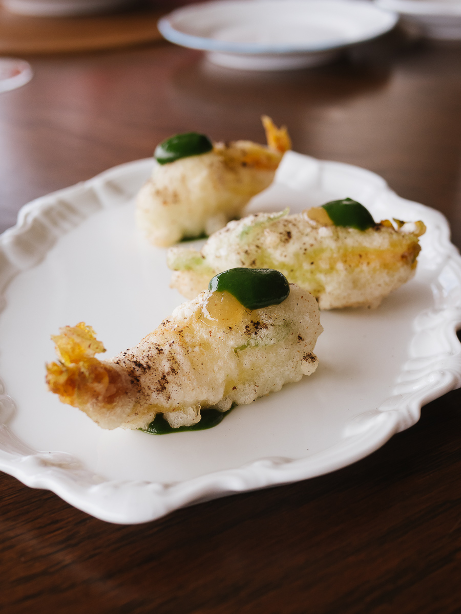 Sempre dall’orto, i fiori di zucca, sono ripieni di ricotta, amaretti e Parmigiano, una punteggiatina di mostarda di mele campanine si fa carico dell’accenno acidulo, mentre una salsa di erbe aromatiche e aceto di sambuco conduce a una chiusura balsamica.