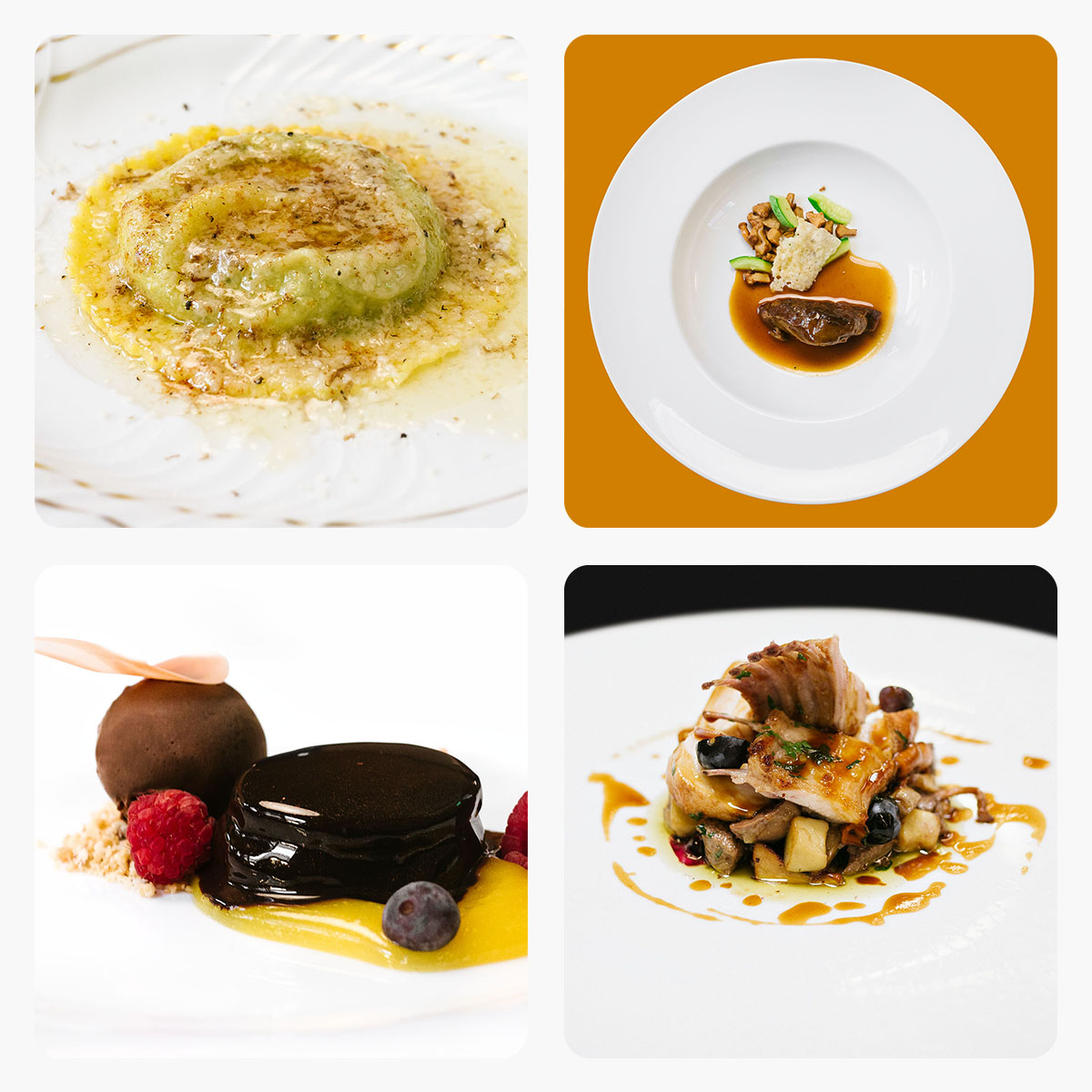 Lo stile degli interni è di una eleganza senza età, dove argenti, tappezzerie floreali e divani chesterfield si combinano alle opere di Schifano, Festa e Angeli, il classico che si amalgama al pop sortendo una fastosità equilibrata, mai eccessiva. Come per la cuisine, un lussuoso comfort food, dove si lavora di creatività attorno a capisaldi come l’uovo in raviolo che viene fatto precedere da un filetto di sgombro arrostito con pomodorini profumati al basilico, una carrellata di territorialità con i bonbon di parmigiano con una mousse di mortadella e pistacchio e la violazione della sacralità del tortellino che viene fritto e trasformato in un vincente fingerfood. In aggiunta, una oliva con ripieno di carne e grissini alla paprica abbinati alla maionese di rucola.