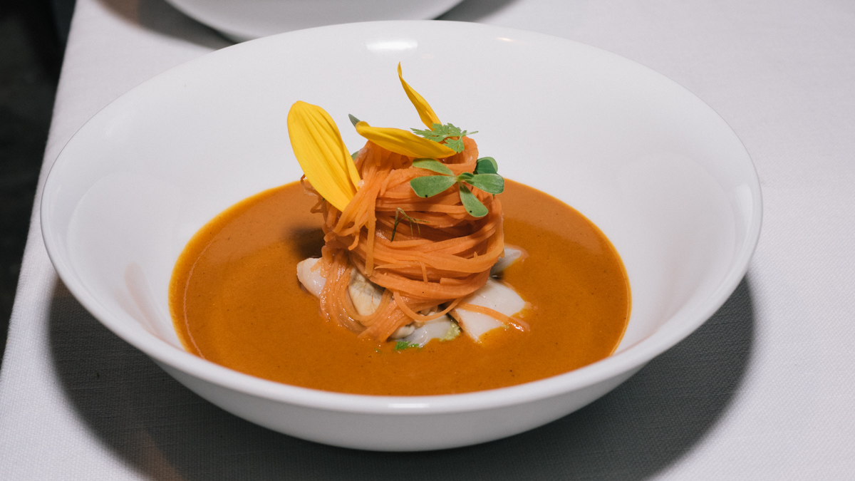 Tagliolini di patata americana, con cozze e capesante in una intensa bisque orientale per Lopez, Kondo e Lunghi di un comfort estremamente sofisticato.